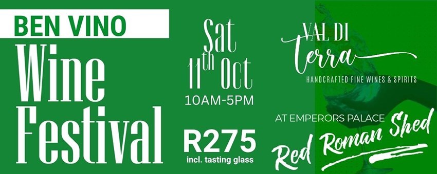 Val Di Terra Events is thrilled to bring you the next Ben Vino Wine Festival at the stunning Red Roman Shed, - a spacious, weather-proof venue at Emperors Palace, next to O.R. Tambo airport.